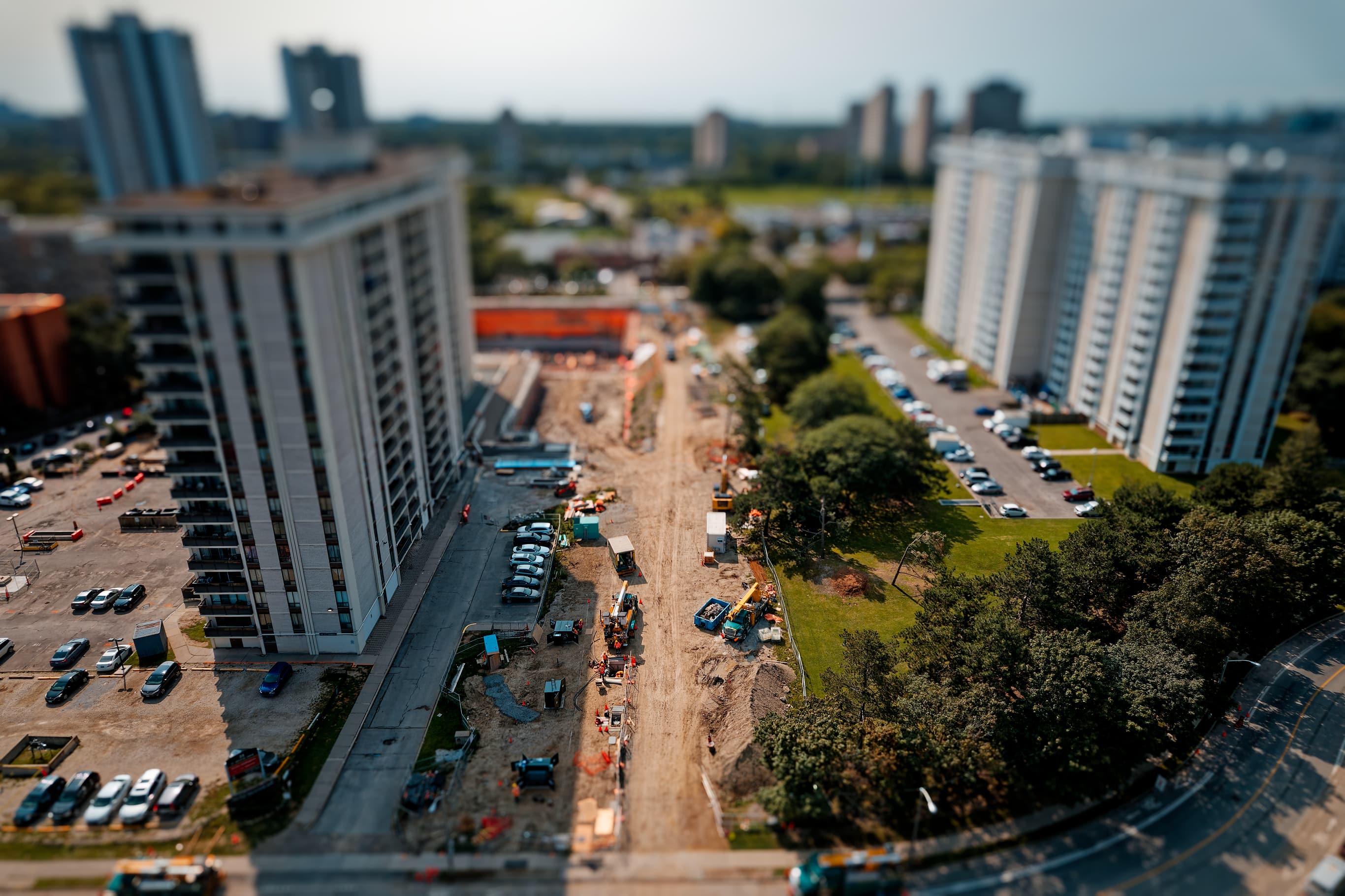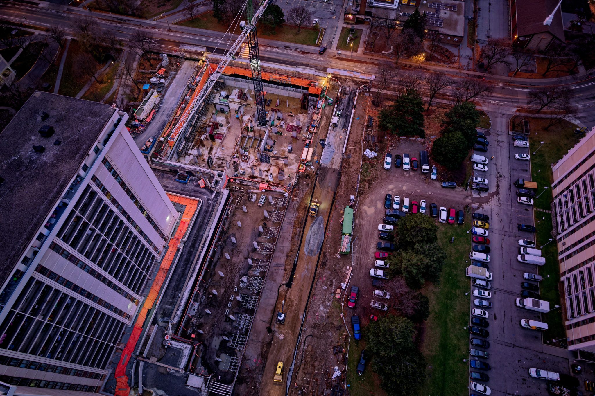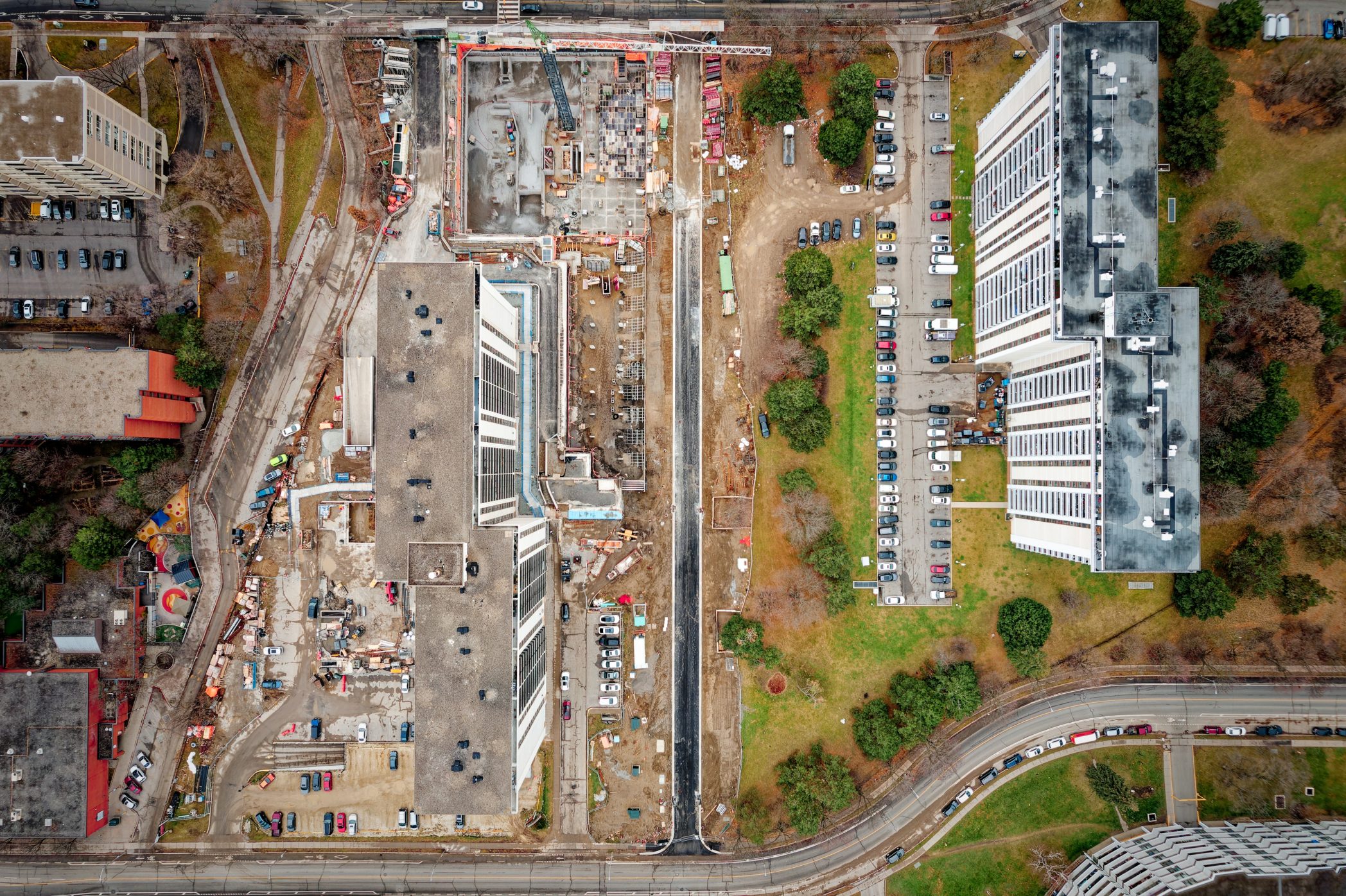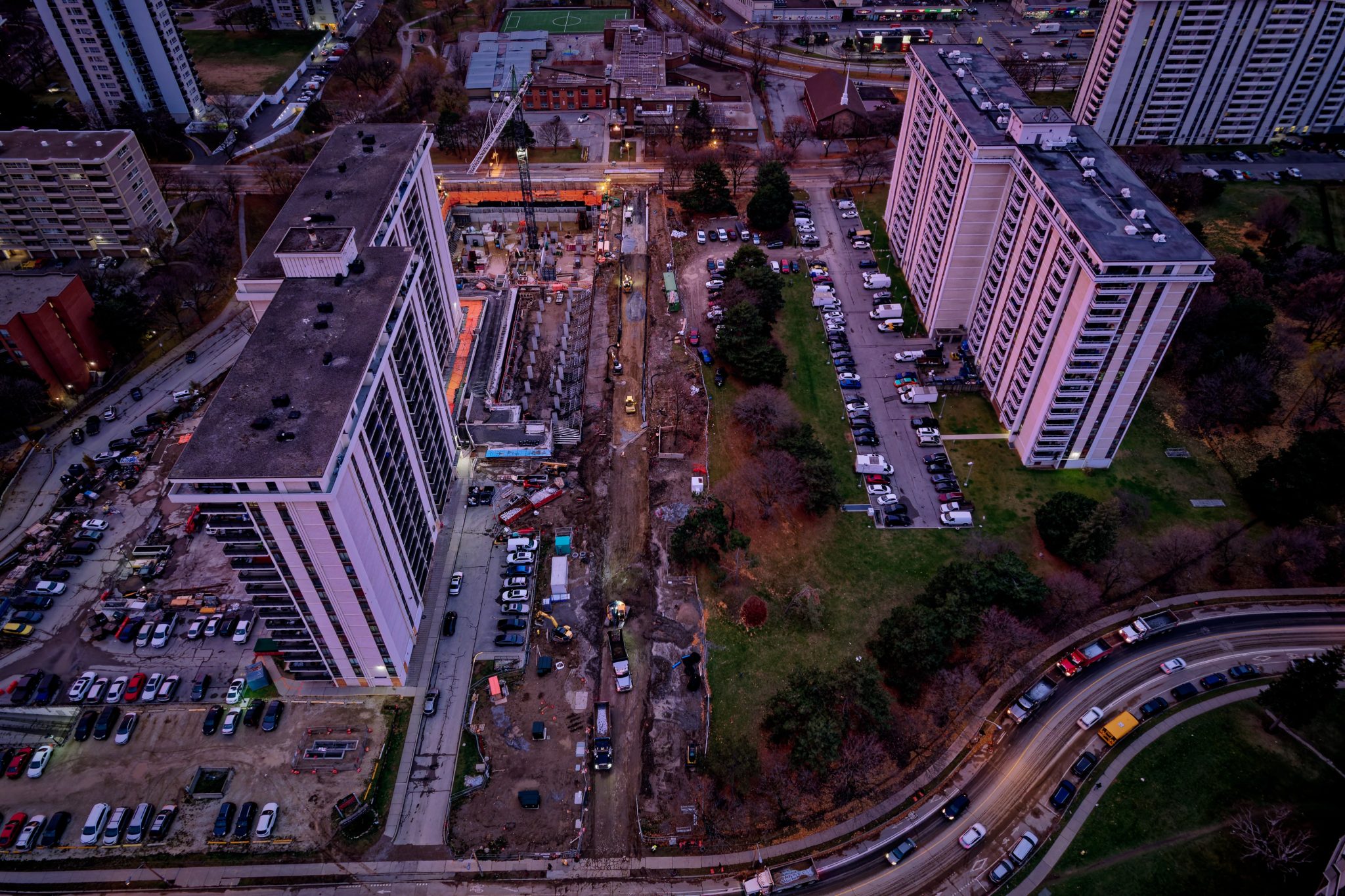 As part of ongoing municipal infrastructure improvements, Stratus Geomatics provided full surveying services for the construction of a new roadway segment within a constrained urban corridor for high rise buildings. The project required high-precision survey control, complex utility coordination, and detailed construction layout for both transportation and underground utility components.